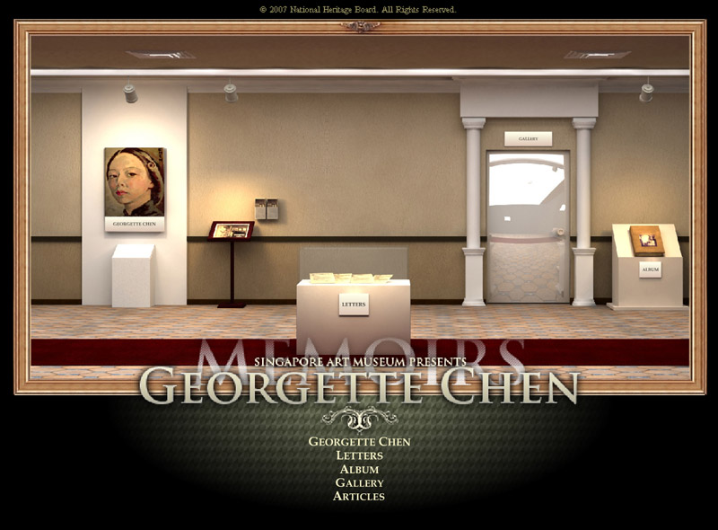 Georgette Chen was an interactive project done for the launch of her exhibition at the Singapore Art Museum. It includes a gallery of her art works, letters she wrote personally and articles about her. Throught the interactive piece, users can find out more about her life and works.